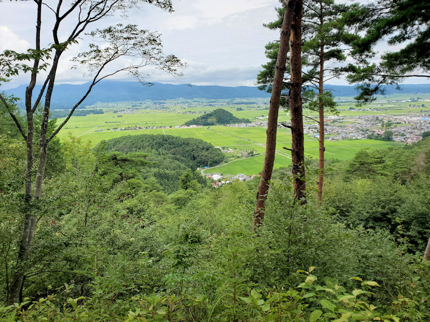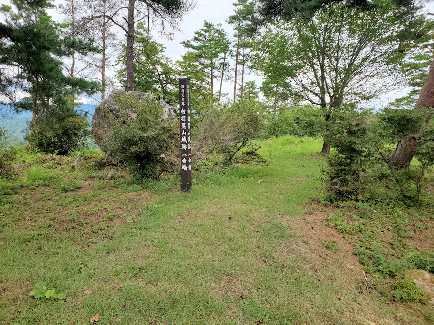 虎口跡を抜けると、そこに山頂部分(第一曲輪趾)がある。眼下には会津盆地の広大な地形が広がっている。