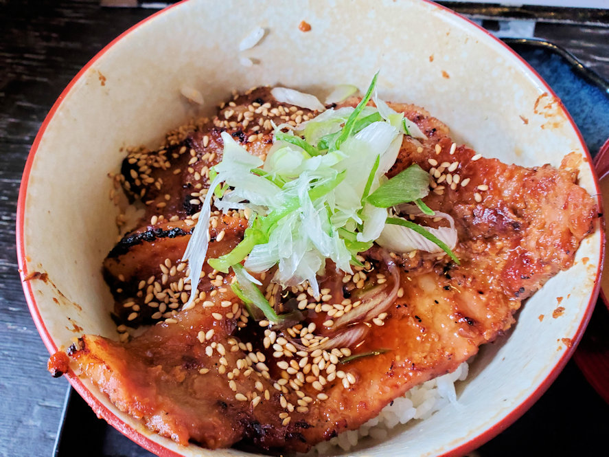 2021年12月09日 「ちんばた」の味噌豚丼 秩父鉄道の秩父駅から徒歩20分程の場所にある肉料理の店です。豚丼や唐揚げ丼などの丼物の他、トンカツ等といったメニューもあります。「駅から20分」と書きましたが、単なる20分ではなく、結構標高差があり、坂道を上がっていかなければなりません。秋風が涼しく吹いていく所で坂道を上がるのは結構気持ちが良いものです。現着は11:30頃。日曜日のせいか、店の前は車やバイクでごった返していました。バイクの数が目立ったので、ライダーさん御用達のお店なのでしょうか。店の前には待ち行列が出来ていましたが、回転が良さそうだったので並ぶことにしました。待ち時間は20分弱だったので、概ね読みは正しかったようです。注文したのは「豚ミソ丼」。このお店の一番人気だそうです。味噌汁とお新香がついて980円というのは、良心的な価格と言えましょう。本命の味噌ぶた丼は、その名の通り、味噌味の焼き豚が御飯に乗っているシンプルなもの。豚肉の他にはゴマが少々とネギが乗っていて、彩を添えます。豚肉は香ばしく焼きあがっており、噛むと肉の旨味が口の中に沁みてきます。御飯、薬味との相性も良く、くどい感じが全くありません。味噌汁も豆腐とワカメが少し入っているだけのシンプルな味でしたが、美味しかったです。個人的はこういう感じの味噌汁が結構好きです。感染対策もしっかりしてあって、4人掛けのボックス席は他と完全に仕切られているだけでなく、それぞれのボックス席にも縦にアクリル板で仕切ってあり、ボックス席を2人で使う場合にも飛沫感染しないような配慮がされています。ここまで感染対策を徹底している事例は初めてみました。お奨め度★★★★ 大和美豚 豚肉 豚 極厚 とんかつ 150g×3枚入 送料無料 豚かつ トンカツ 冷凍便価格:3,980円(税込、送料無料) (2023/12/4時点) 楽天で購入 タグ :#秩父#豚丼#味噌豚丼