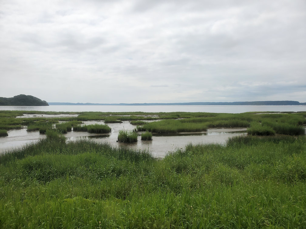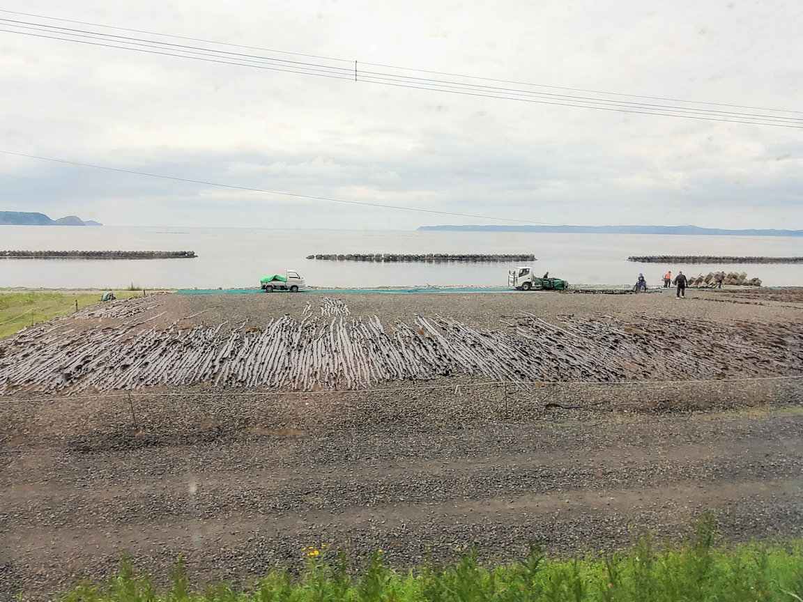 途中の主要駅である厚岸が近づくと、右手に太平洋が見えてきます。またコンブ漁が盛んな地域なので、収穫されたコンブが海岸に並べられています。