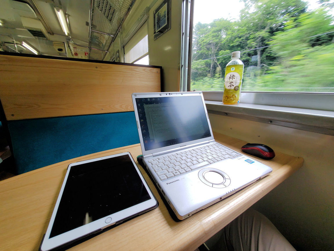 次の茶内駅では列車交換があり、乗客の約半数がここで降りていきました。そこで後方に連結されているキハ40系に移動。こちらはボックス席の仕様で、椅子とテーブルが雰囲気のある木目調になっていました。ボックス席の1つを丸々占領し、パソコンを広げて優雅に車窓風景を楽しみます。 。