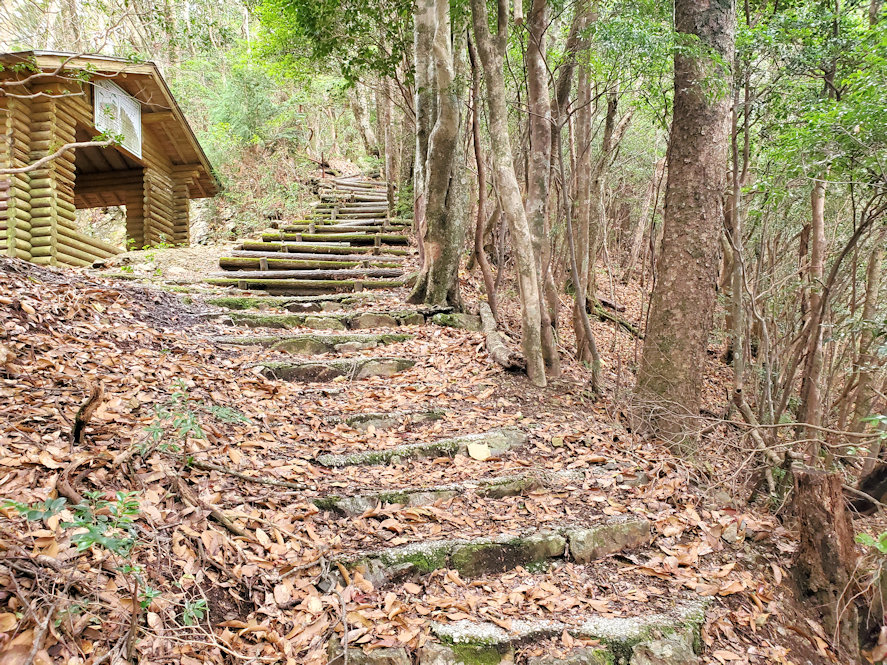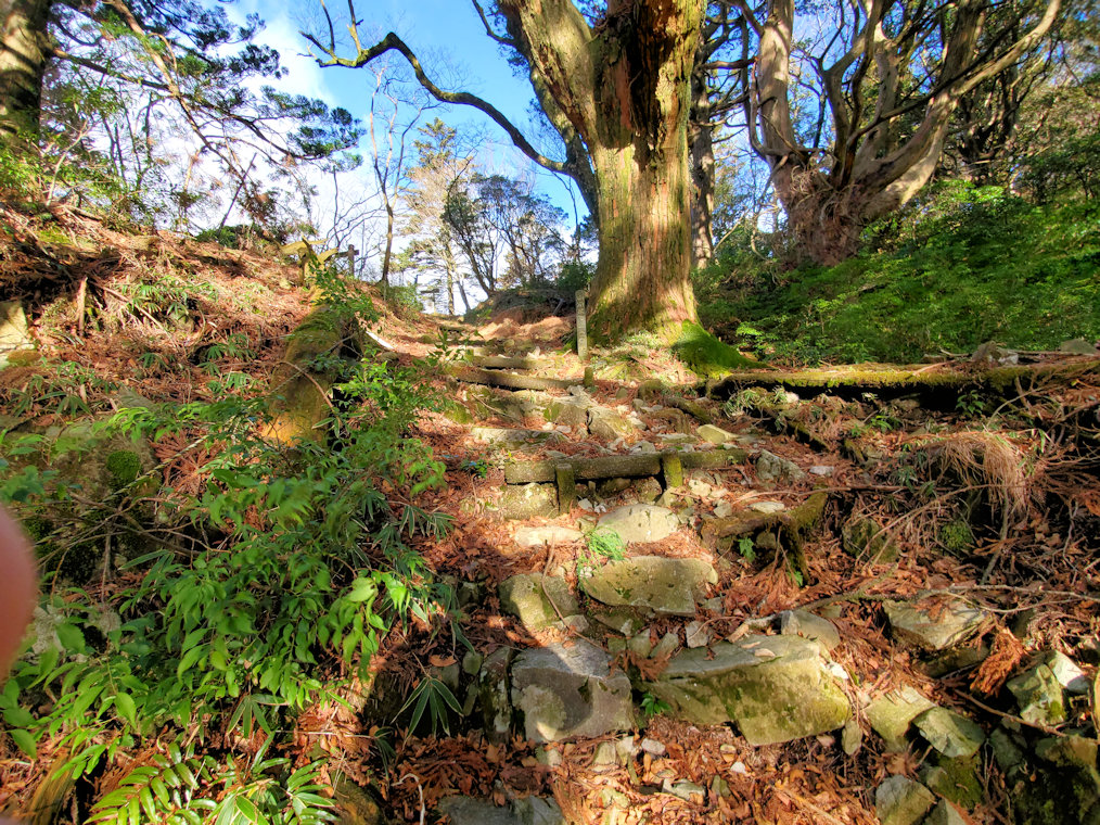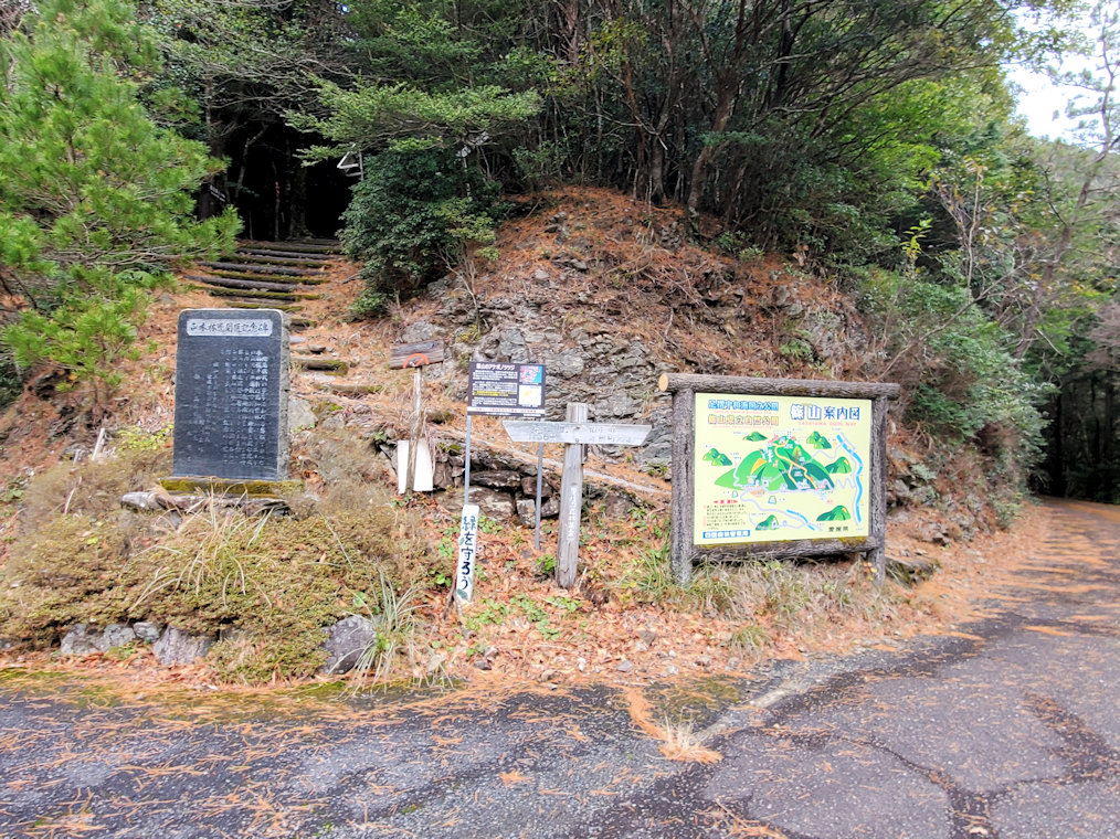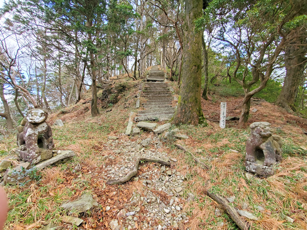 駐車場には他に車の姿はなし。ひょっとしたら一人登山かも。そんなことを思いながらも歩き始めた。頂上までは1kmで片道30分ほど。登山というよりは軽いハイキングぐらい。その難易度から言えば、 かつて登った天王山 と同じぐらい。ただ急な山道や滑りやすそうな場所もあったので、慎重に登っていく。